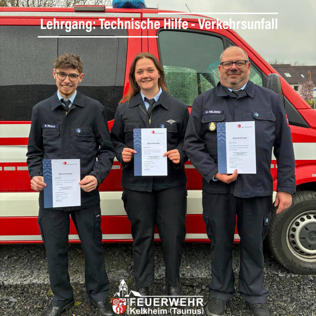 Heute konnten Marlon (Ruppertshain), Denise (Hornau) und Markus (Münster) erfolgreich den Lehrgang Technische Hilfe -Verkehrsunfall (TH-VU) abschließen.