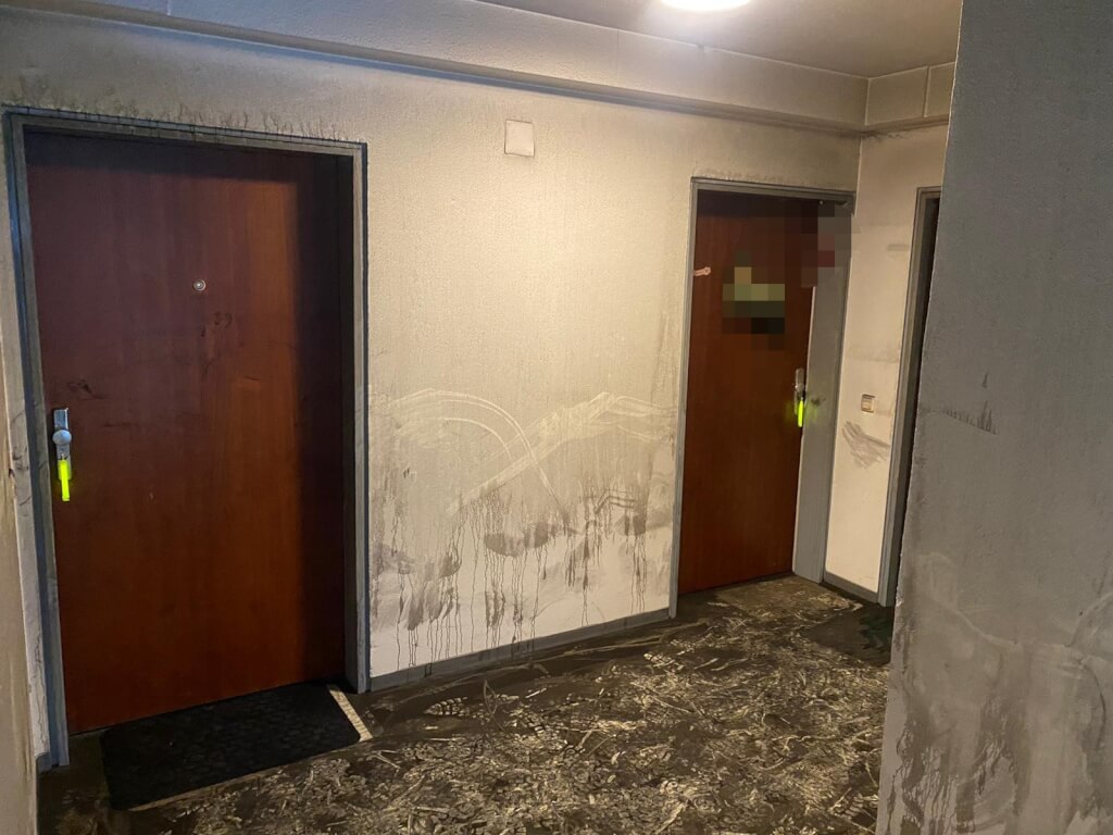 Sofort machten sich Einheiten der Feuerwehr auf den Weg ins 5. Obergeschoss und betraten einen komplett verrauchten Flurbereich, an welchen 6 Wohneinheiten grenzten. Schnell konnte in der Brandwohnung eine Person gefunden und gerettet werden.